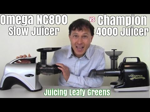 Champion 4000 Juicer vs Omega NC800 Juicing Leafy Greens Review Comparison - Omega Juicer Vs Champion Juicer - John from http://www.discountjuicers.com/ compares the New Champion 4000 Masticating Juicer to the Omega NC800, a horizontal single auger slow juicer.